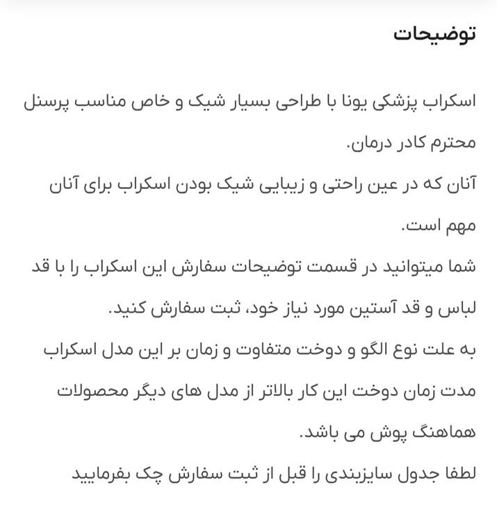 شما میتوانید در قسمت توضیحات سفارش این اسکراب را با قد لباس و قد آستین مورد نیاز خود، ثبت سفارش کنید.